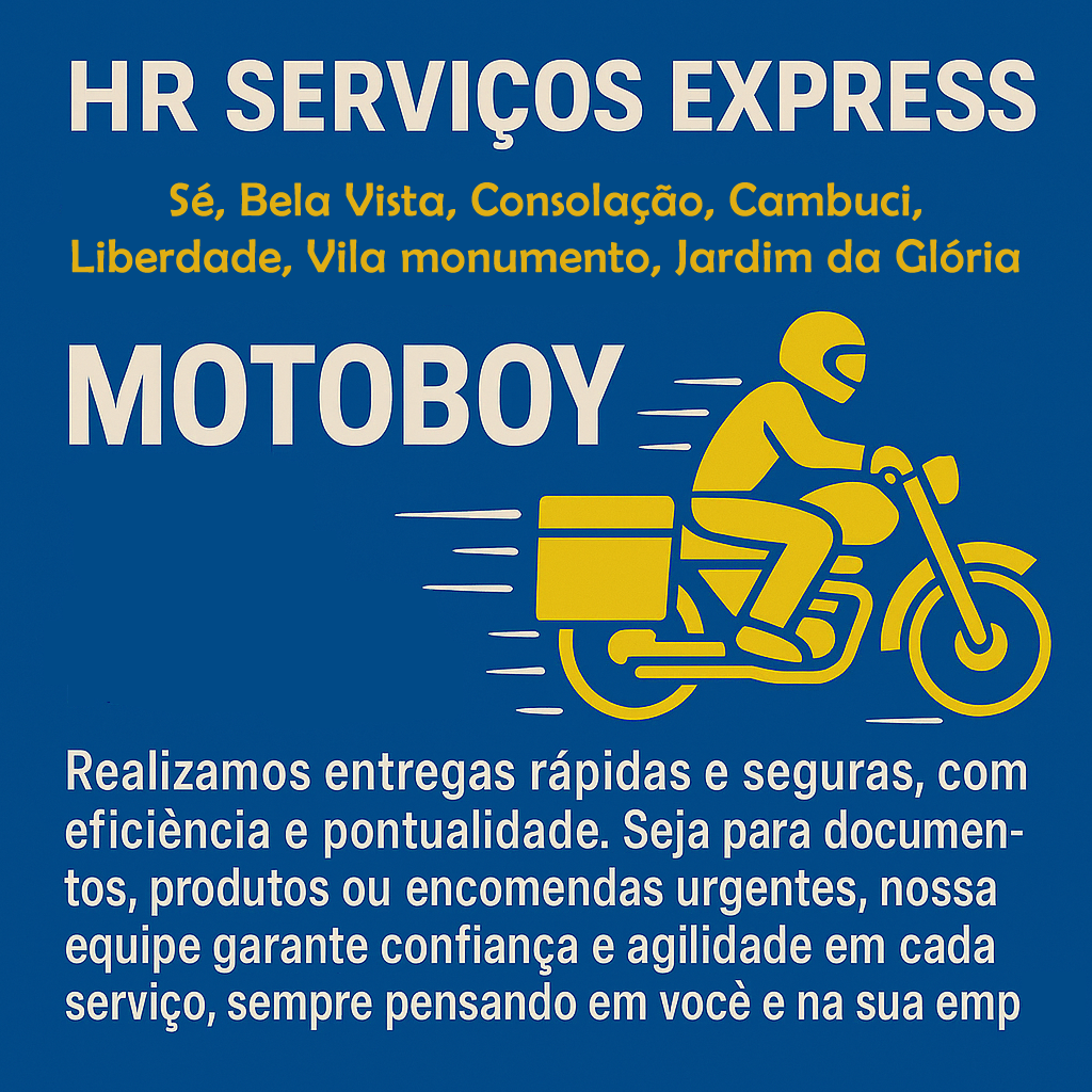 Na HR Serviços Express,  oferecemos motoboy na Sé, Bela Vista, Consolação, Cambuci, Liberdade, Vila monumento, Jardim da Glória Realizamos entregas rápidas e seguras, com eficiência e pontualidade. Seja para documentos, produtos ou encomendas urgentes, nossa equipe garante confiança e agilidade em cada serviço, sempre pensando em você e na sua empresa.