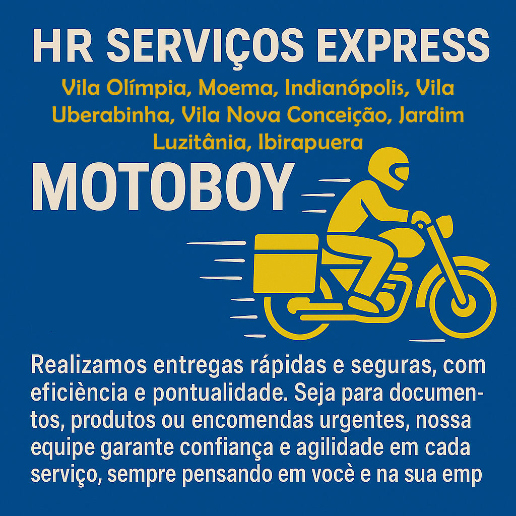 Na HR Serviços Express, oferecemos motoboy na Vila Olímpia, Moema, Indianópolis, Vila Uberabinha, Vila Nova Conceição, Jardim Luzitânia, Ibirapuera. Realizamos entregas rápidas e seguras, com eficiência e pontualidade. Seja para documentos, produtos ou encomendas urgentes, nossa equipe garante confiança e agilidade em cada serviço, sempre pensando em você e na sua empresa.