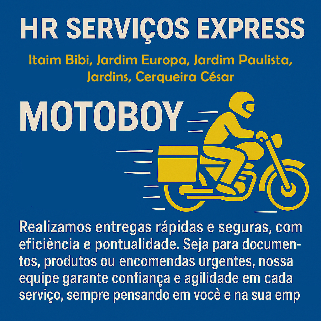 Na HR Serviços Express,  oferecemos motoboy no Itaim Bibi, Jardim Europa, Jardim Paulista, Jardins, Cerqueira César. Realizamos entregas rápidas e seguras, com eficiência e pontualidade. Seja para documentos, produtos ou encomendas urgentes, nossa equipe garante confiança e agilidade em cada serviço, sempre pensando em você e na sua empresa.